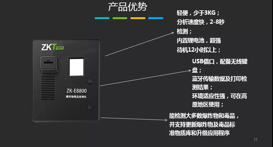 便攜式爆炸物毒品探測儀ZK-E8800是由中控門禁自主研發、生產的爆炸物和毒品檢查設備。該產品基于國際上先進的離子遷移譜(IMS)技術原理,能夠快速、精準地檢測并判斷痕量爆炸物及毒品的種類,具有快速、準確地檢測痕量爆炸物、毒品的功能,產品性能達到同類產品國際先進水平,具有易于使用,耗材成本低和維護方便等優勢。